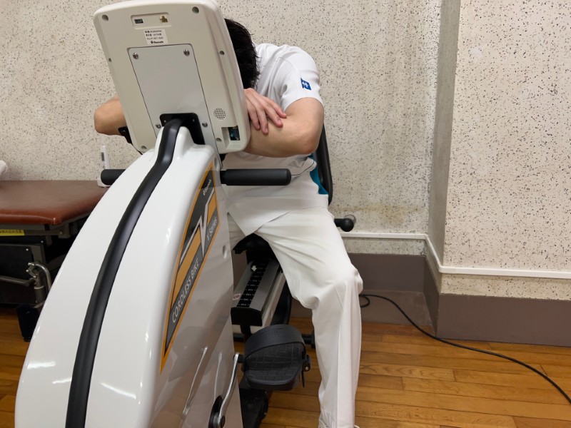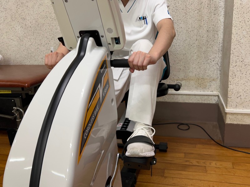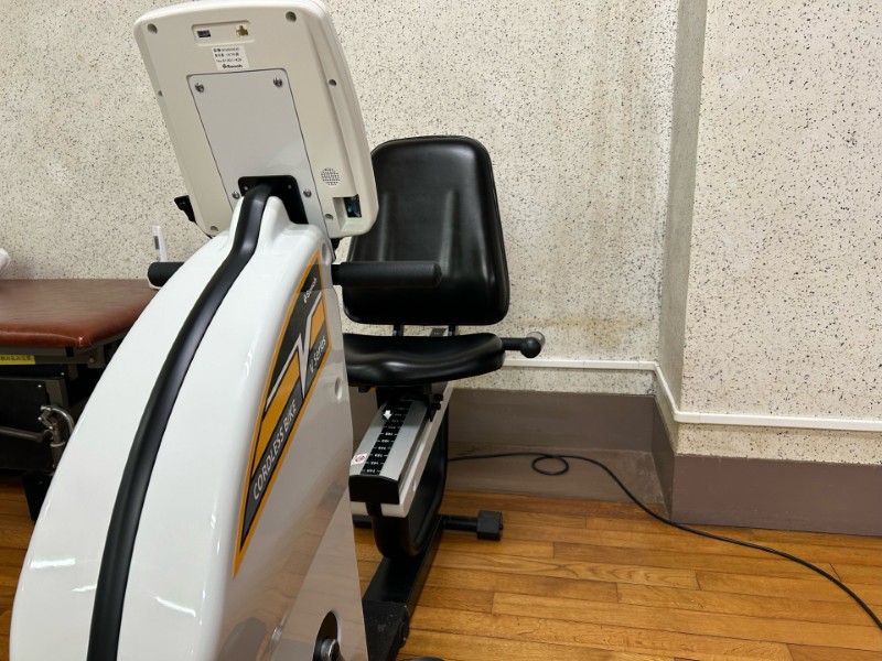 次はエルゴメータです。自転車のようにペダルが付いていて漕ぐことができます。ペダルを漕ぐ際の負荷量を調整することも可能で、低負荷で長時間漕ぐことで体力向上に使うこともできますし高負荷で短時間しっかりと漕ぐことで筋力トレーニングに使うこともできます。