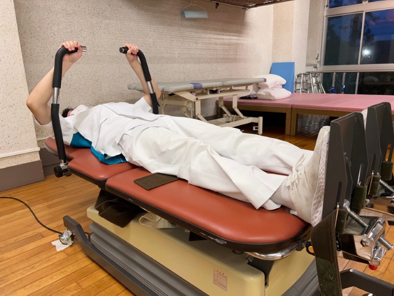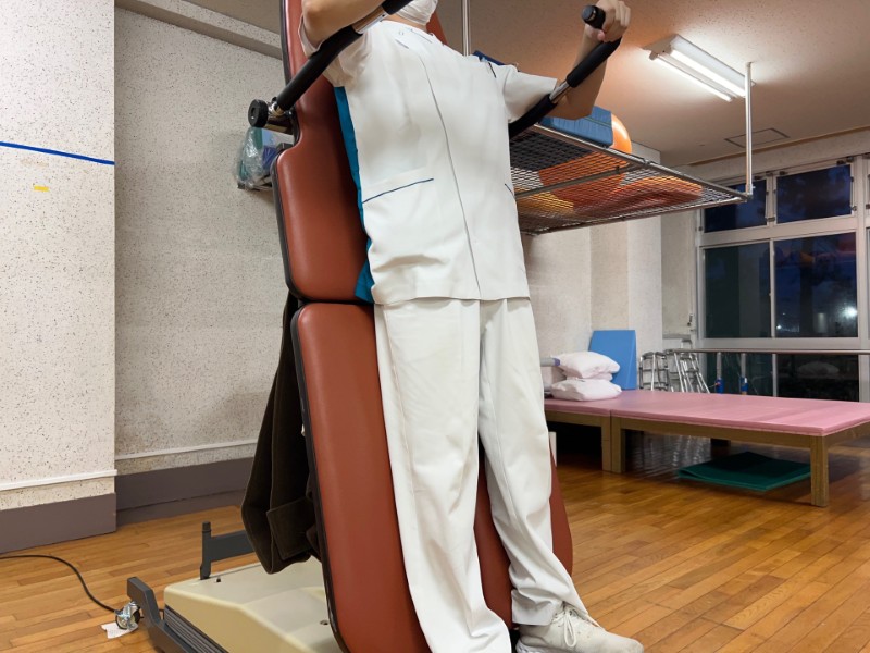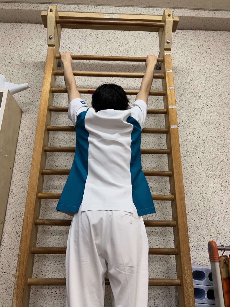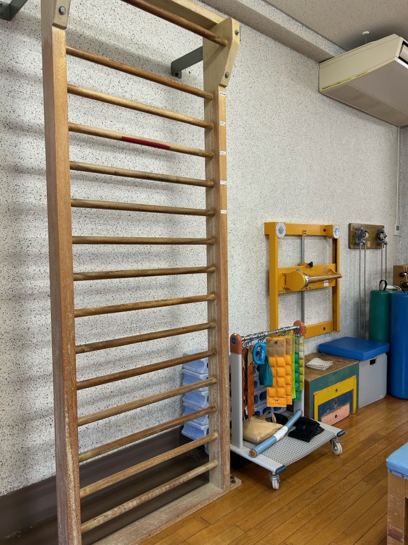 次は肋木です。学校の体育館とかにおいてあるイメージが強いかと思います。当院では登るより体を伸ばすことに使われることが多いです。