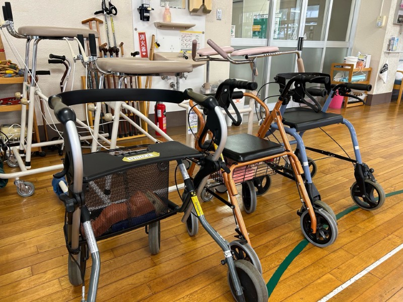 こちらは歩行器です。安定した歩行のために両手で掴んだり、肘で支えたりなど症状や状態に合ったもので歩く練習をしています。